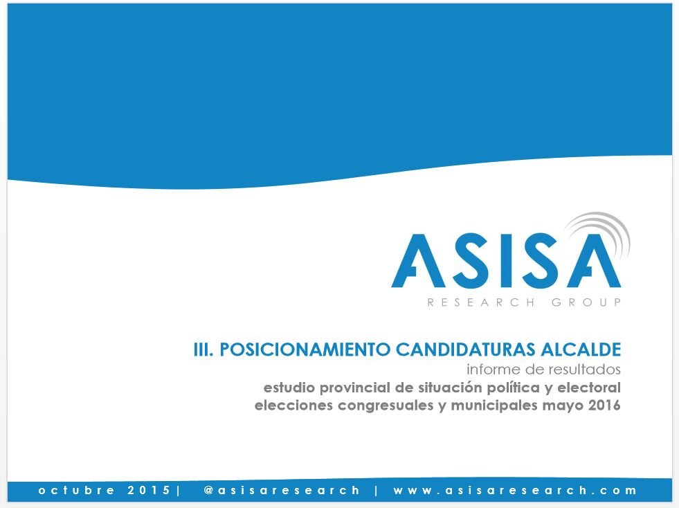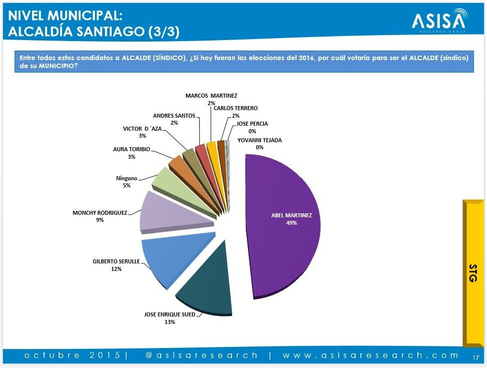 Asisa también cuestionó a los encuestados ¿Si hoy fueran las elecciones del 2016, por cuál votaría para ser el ALCALDE (síndico) de su MUNICIPIO?, lo cual arrojó los resultados siguientes: Un 49 por ciento lo haría por Abel Martínez; un 13 por ciento por José enrique Sued; un 12 por ciento por Gilberto Serulle; un 9 por ciento por Monchy Rodríguez; un cinco por ciento dijo que por ninguno y el restante 12 por ciento se divide entre Aura Toribio, Víctor De Aza, Andrés Santos, Marcos Martínez, Carlos Terrero y José Percia.