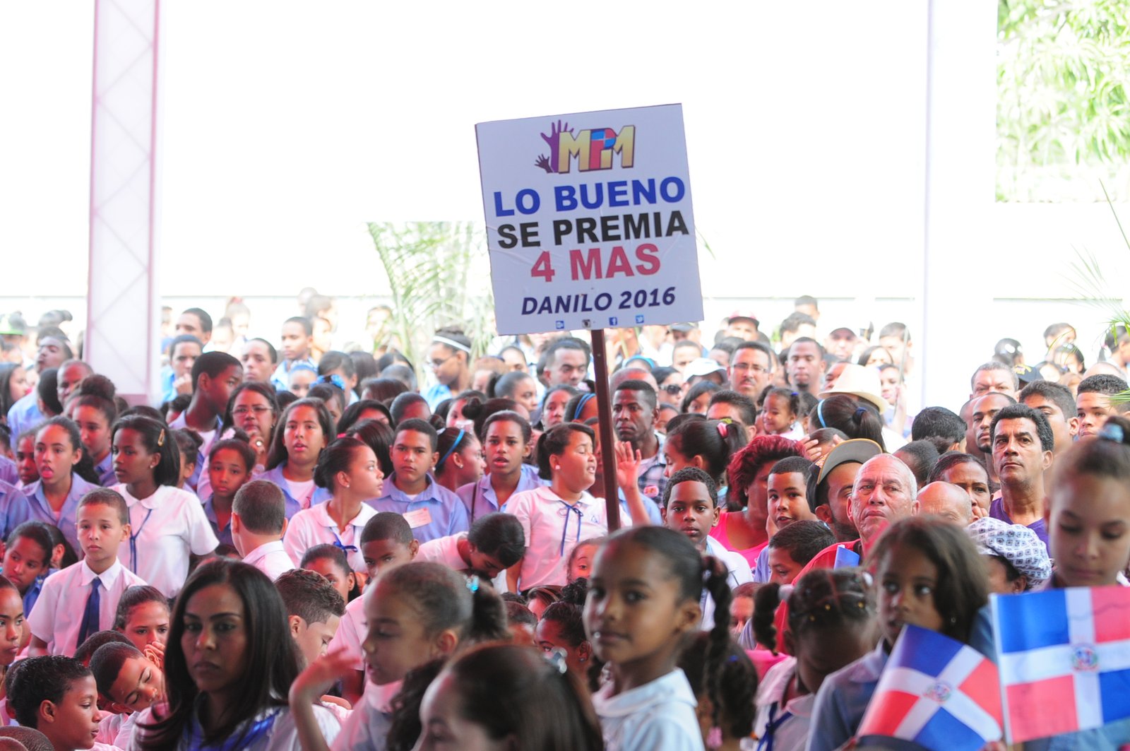 Hoy Noticias/Santiago– En el acto de la inaguraciones de once escuelas con 156 aulas, integradas a la Jornada de Tanda Extendida, con una inversión de 441 millones 303 mil pesos, se observaban personas promoviendo al presidente Medina con letreros como “Lo bueno se preserva, Danilo 2016-2020”. “El pueblo es el que manda Danilo cuatro años más, Movimiento el Pueblo Manda” y “Lo bueno se premia, Danilo cuatro años más” entre otros.y “Lo bueno se premia, Danilo cuatro años más” entre otros.