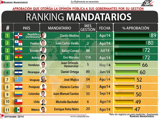 Hoy Noticias/Santo Domingo, R.D.- El presidente Danilo Medina obtuvo el mayor nivel de aprobación entre 19 mandatarios de América evaluados en la consulta realizada por la firma mexicana Mitofsky.