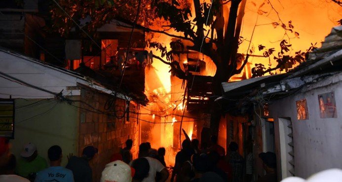 El siniestro se inició próximo a las siete de la noche y desde entonces vecinos con latas llena de agua y los bomberos trataban de sofocar las llamas.